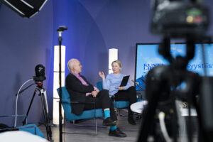 Tyylikkäät ja tilavat studiomme mukautuvat erilaisiin tarpeisiin — pidätpä sitten yksittäisen puheenvuoron tai järjestät paneelikeskustelun. Lähetykseen on myös helppo lisätä esimerkiksi yritysesittelyjä, diaesityksiä, kyselyitä, tai etukäteen kuvattuja inserttivideoita. Etäpuhujat on helppo saada lähetykseen mukaan esimerkiksi Teamsin avulla.
